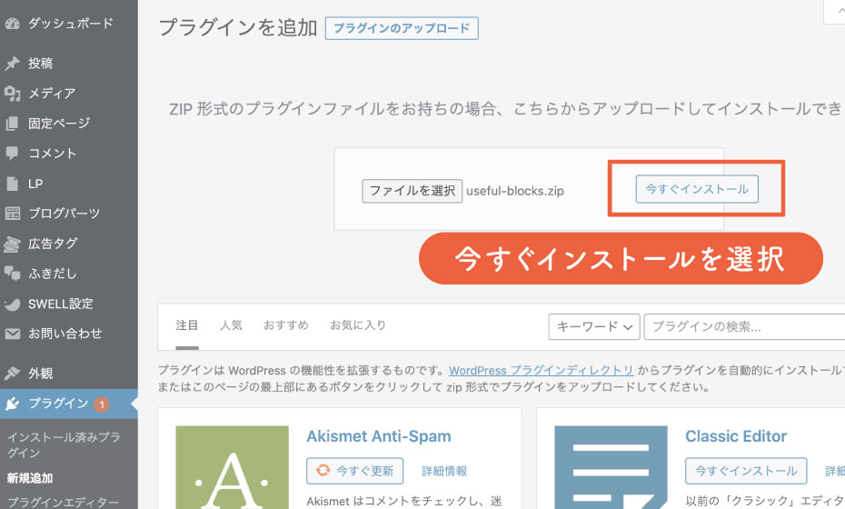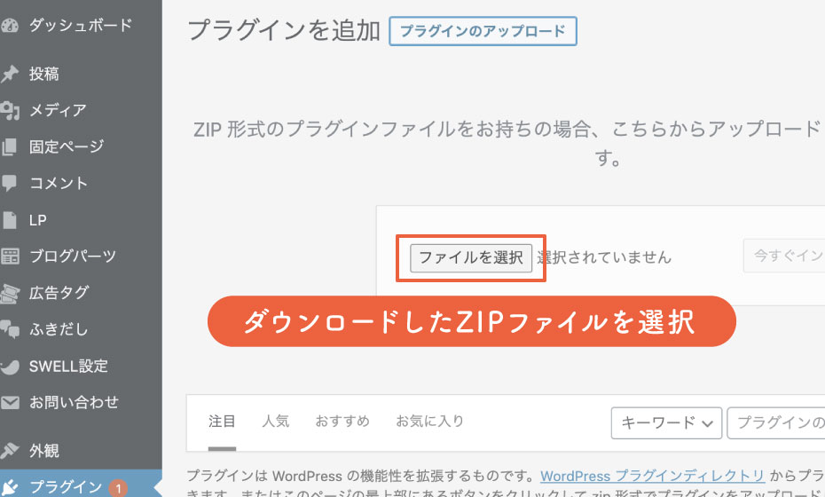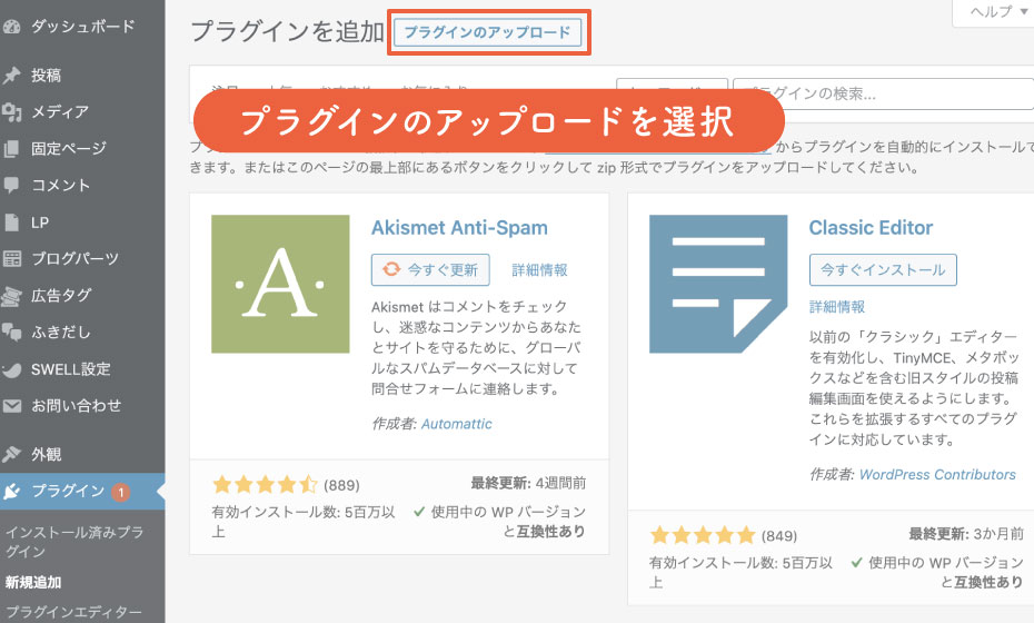 画面上部の「プラグインをアップロード」を選択