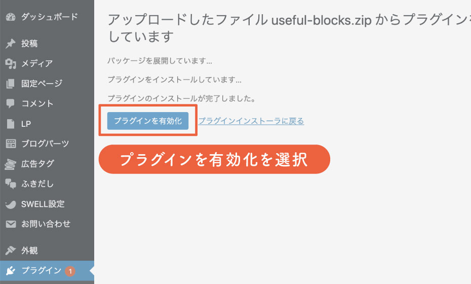 プラグインを有効化を選択して完了です