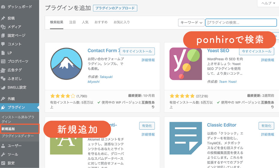 WordPressのプラグイン検索からダウンロードする方法です。