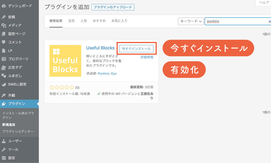 プラグイン、新規追加で「ponhiro」を検索